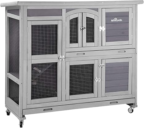 Petsfit Rabbit Hutch Two-Story Wood Bunny Cage Indoor Outdoor with 2 Pull-Out Trays 3 Doors Roof Open. Durable Hutch If youre looking for a modern rabbit hutch this Aivituvin model is a great choice for both indoor or outdoor use. It measures 50L X 25W X 36H has a black linoleum roof and comes in either natural wood or auburn and white.